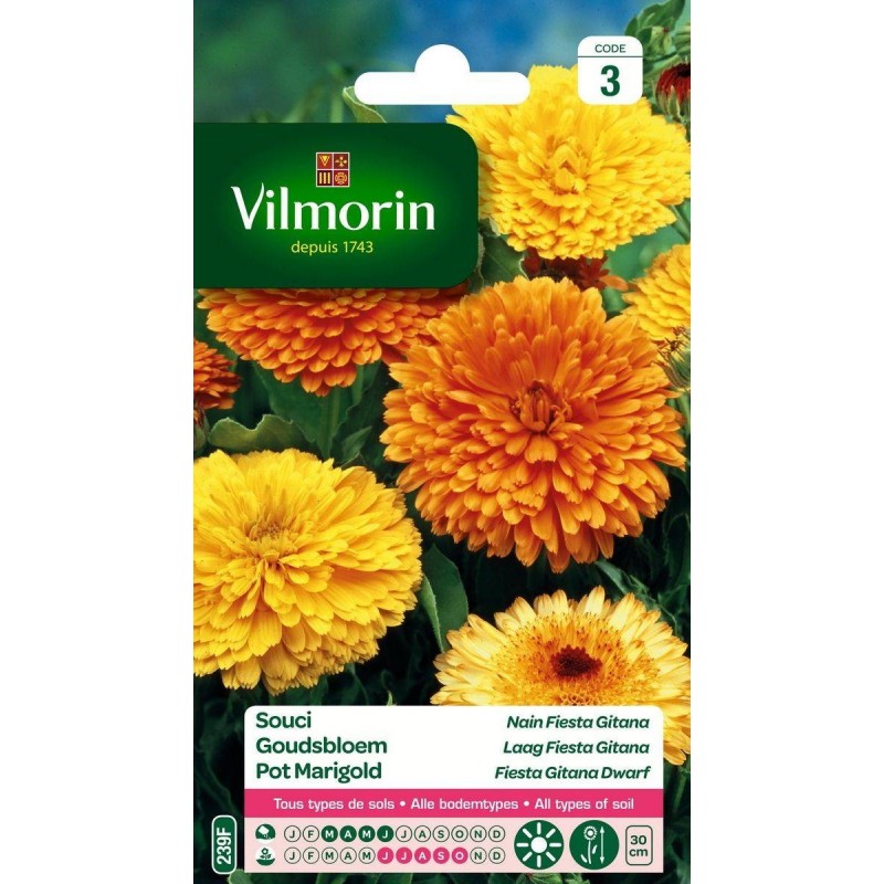 Peu exigeant et très facile à réussir, semez les soucis partout où vous ne savez pas quoi planter d'autre. Leur floraison abondante et longue, leurs couleurs vives embelliront tout votre jardin (massifs, bordures...). Les soucis sont de très belles fleurs à couper pour la réalisation de bouquets. Cette variété de souci nain vous donnera de très belles fleurs doubles d'un beau jaune orangé.