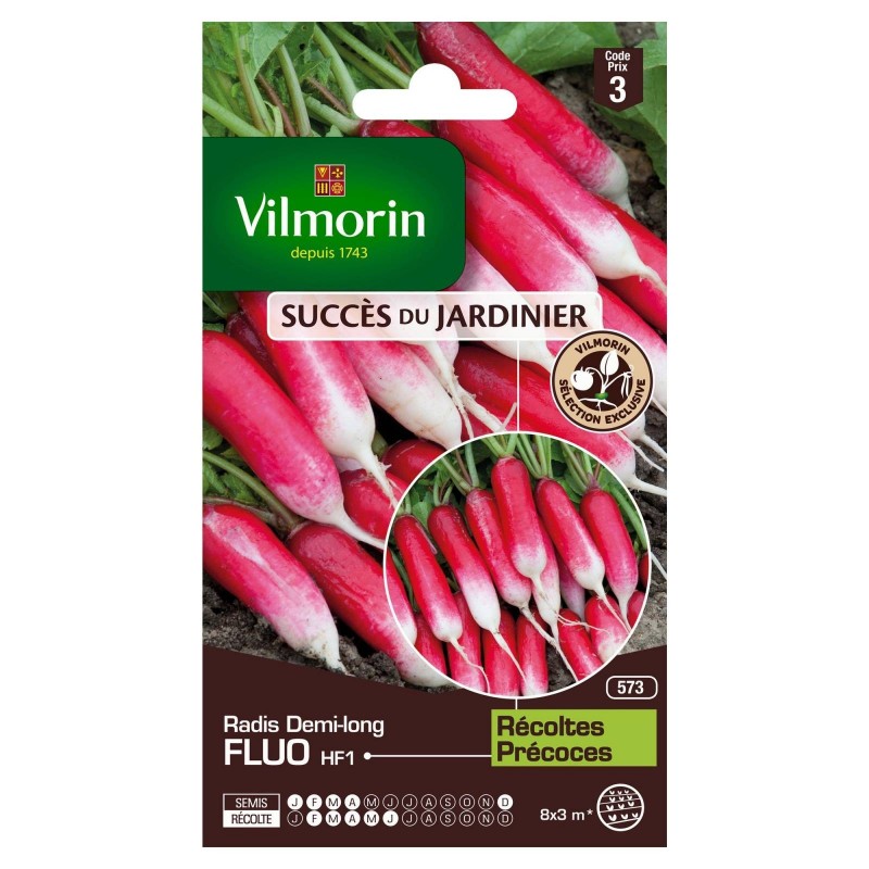 Variété écarlate à bout blanc, issue de la recherche Vilmorin, alliant toutes les qualités que l'on peut souhaiter : précoce, croquant, savoureux et non piquant.