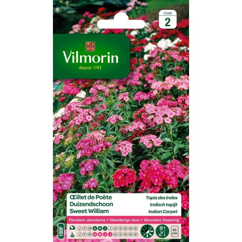 Variété naine, tapissante produit de magnifiques bouquets composés de multiples fleurs simples dont les coloris vifs varient du blanc au grenat. Ces oeillets formeront également de beaux tapis fleuris dans vos rocailles, en jardinières ou en pots.
