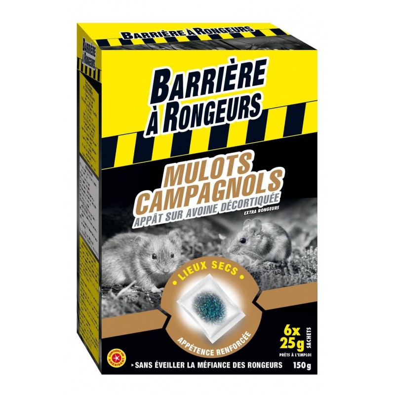Sachets d'appâts sur avoine décortiquée prêts à l?emploi. Permet d?éliminer les mulots et les campagnols. Sa formulaton très appétante à base d?anti-coagulant agit sans éveiller la méfiance des autres rongeurs qui continuent à consommer le produit.
