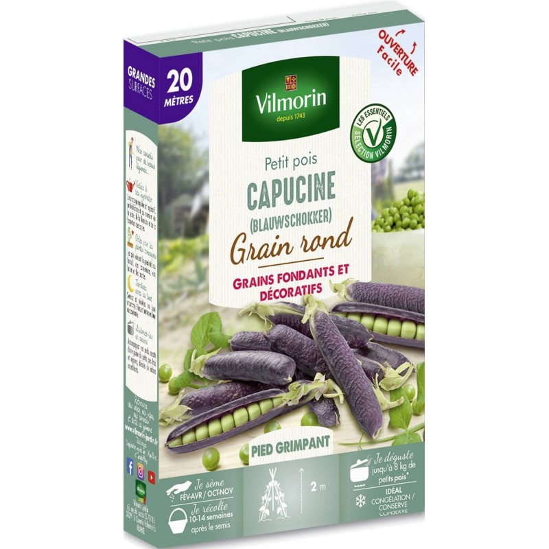 Ce pois, originaire de Hollande, doit son nom de 'capucine' à la couleur très originale de ses cosses et de ses jolies fleurs roses et lilas.Également surnommé 'pois gris', il contient dans chaque cosse 7 à 10 grains, dont la couleur est plutôt vert bleuté.Cette variété grimpante permet de belles récoltes sur une longue période.Cette boîte contient la juste dose de graines pour semer 20 mètres linéaires de petits pois.
