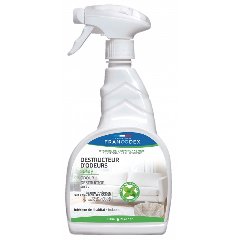 Grâce à son action enzymatique sur la matière organique responsable des mauvaises odeurs, le DESTRUCTEUR D'ODEURS FRANCODEX élimine durablement les mauvaises odeurs dans l'environnement des animaux de compagnie tout en laissant une odeur fraîche de menthe et d'eucalyptus, bien acceptée par les animaux. Formulé avec 93% d'ingrédients d'origine naturelle, il s'utilise sur tous types de surfaces et textiles non fragiles.