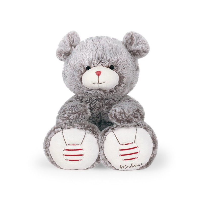 Ours de 38 cm à la fourrure couleur grise, choisie spécialement pour sa douceur exceptionnelle. Ses longs bras et grandes oreilles sont faciles à attraper, et offrent de tendres grands câlins. Sa grande taille lui permet de bien tenir assis pour une présentation optimale dans la chambre de bébé. Un minuscule nez rouge, des petons brodés marinière et un patch Rouge Kaloo signent chacun des produits de la gamme et permet de les identifier immédiatement.