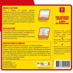 • Solution prête à l'emploi, sous forme de mini-granulés imprégnés d'une substance répulsive à effet sensoriel longue durée (au contact de l'humidité du sol, les minigranulés diffusent un gaz qui perturbe les sens olfactif et gustatif des reptiles).