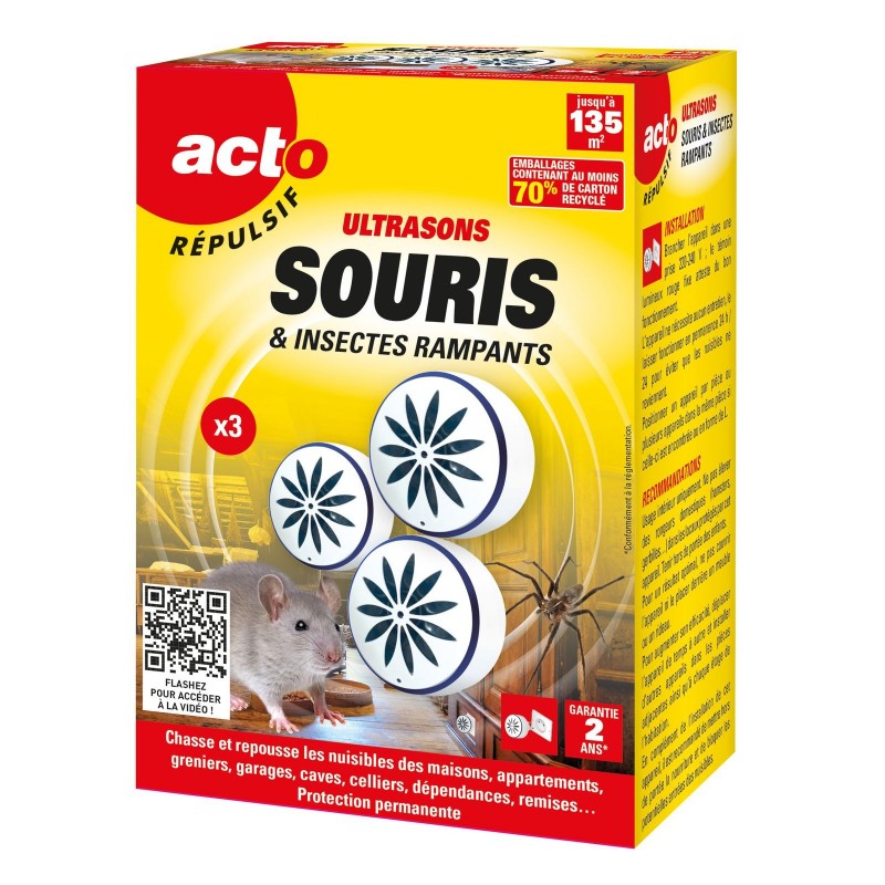 ACTO RÉPULSIFS ULTRASONS Souris&insectes rampants Jusqu'à 135m2 X3