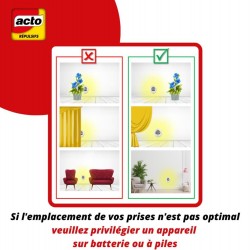 • Branché sur une prise secteur, 1 émetteur protège en permanence une surface de 45 m2 : cave, garage…