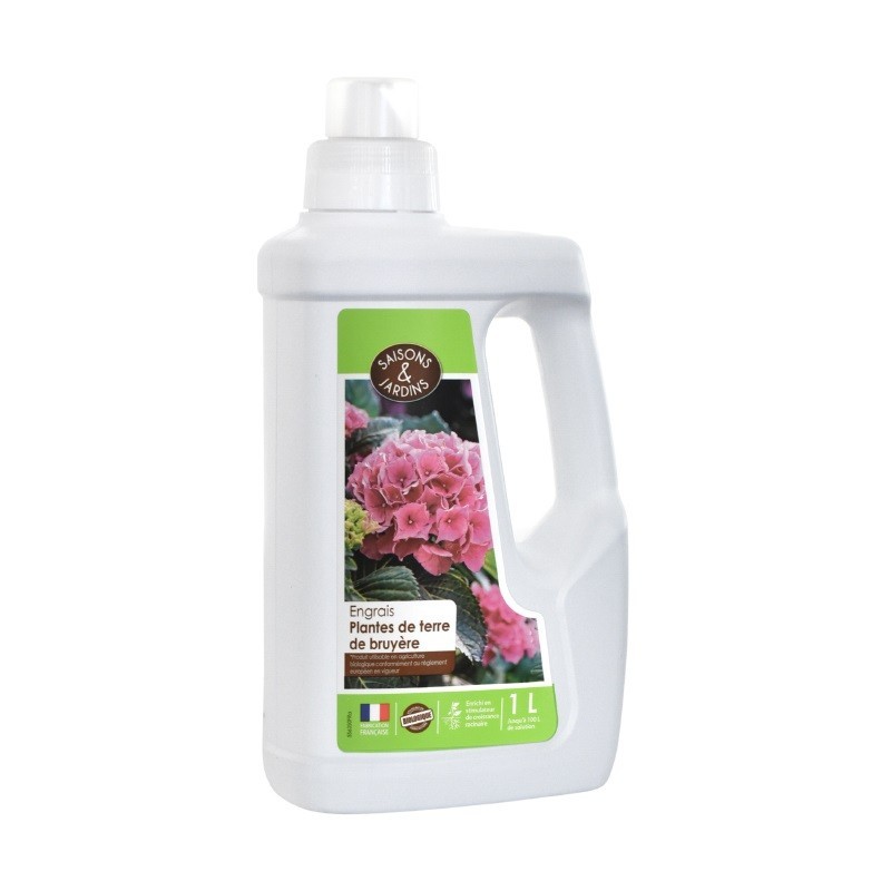 L'engrais 'plantes de terre de bruyère' liquide Saisons & Jardins® apporte les éléments indispensables à la nutrition des plantes: azote, phosphore et potassium. Cet engrais organique contient en plus un stimulateur de croissance racinaire pour une meilleure absorption de l'eau et des éléments nutritifs par le végétal. Il est pratique à verser grâce à son flacon avec poignée.