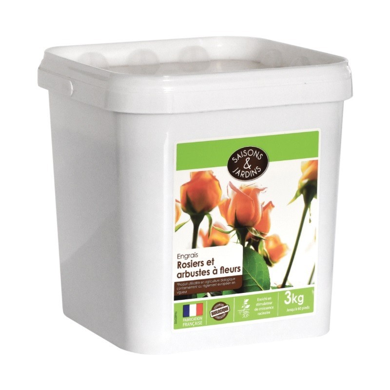 L'engrais 'rosiers et arbustes à fleurs' entretient la fertilité du sol en apportant à la fois de la matière organique et les 3 éléments majeurs (azote, phosphore et potassium) indispensables à la nutrition des plantes. Cet engrais contient en plus un stimulateur de croissance racinaire pour une meilleure absorption de l'eau et des éléments nutritifs par le végétal. Il est pratique à utiliser avec son emballage refermable