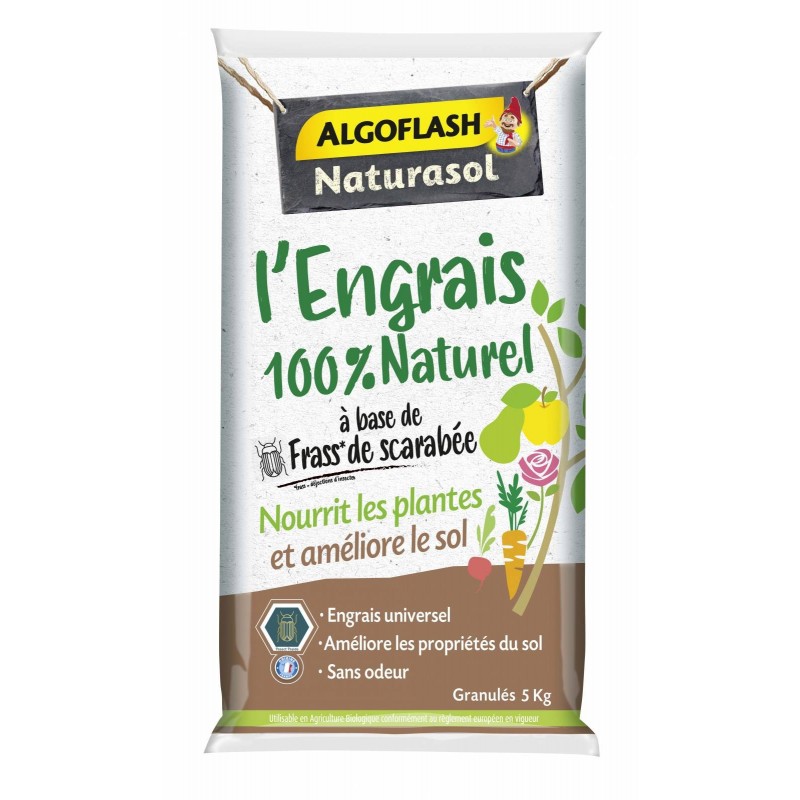 L'Engrais 100% naturel complet à base de Frass de scarabée nourrit à la fois les plantes et améliore le sol grâce à sa composition extrèmement riche en matière organique. Il posséde une double action : Action Fertilisante qui favorise la croissance des plantes et augmente le rendement des cultures et Action Amendement qui stimule l'activité microbienne du sol et améliore la structure du sol. Sans odeur et sans traces d'antibiotiques. Label Produit Naturel. Utilisable en Agriculture Biologique*.