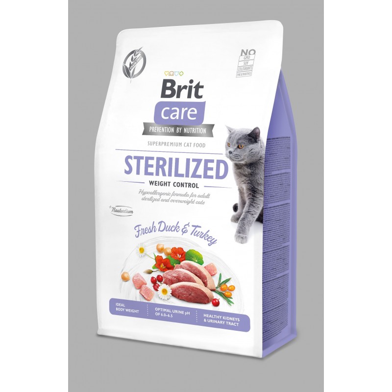 Brit Care Cat Grain-Free - STERILIZED AND WEIGHT CONTROL (STÉRILISÉS ET CONTRÔLE DU POIDS) Canard et dinde frais. Aliment complet pour chats adultes et stérilisés. La formule hypoallergénique riche en fibres, en protéines et avec une teneur réduite en matières grasses aide à maintenir la santé du tube digestif et un poids corporel idéal. Les fruits et herbes contenus dans la recette sont riches en vitamines et en flavonoïdes et assureront à votre chat une belle apparence, une longue vie et une vie en meilleure santé.