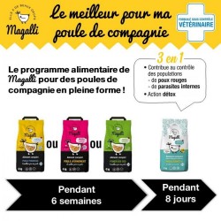 Magalli Poule Pondeuse Bleu-Blanc-Cœur est formulé sous contrôle vétérinaire pour répondre à 100% des besoins nutritionnels de votre poule et garantir une ponte régulière. Certifié par l'association Bleu-Blanc-Coeur cet aliment est source d’oméga 3 naturels par l’ajout de graines de lin (3%). Magalli, le meilleur pour votre poule de compagnie! Magalli Poule pondeuse BBC se présente sous la forme d’un muesli gourmand. Les flocons et les céréales concassées rendent cette nourriture appétissante car si les poules n’ont pas encore de dents, elles ont un bec et aiment picorer. Les petits granulés complètent l’apport protéique de la ration et le calcium particulaire répond à l’appétit calcique de votre poule pour des coquilles et des os solides. Magalli Poule Pondeuse BBC apporte également des extraits végétaux et huiles essentielles afin de garantir le confort digestif de votre poule: des fientes plus sèches et moins odorantes améliorant l’hygiène du poulailler. Nourriture produite en France, avec des céréales françaises et sans OGM. A distribuer dès l'entrée en ponte (vers 18-20 semaines d'âge, selon la race). L'aliment complet Magalli pondeuse BBC est formulé sous contrôle vétérinaire pour apporter tout ce dont la poule a besoin pour une ponte régulière.
