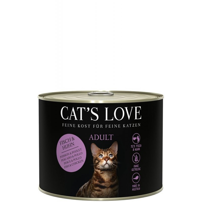 COMPOSITION: Poisson & poulet 92 % (poissons d‘eau douce 40 %, coeur de poulet 22 %, viande de poulet 21 %, foie de poulet 9 %), minéraux, huile de salmon 0,2 %, persil 0,1 %
