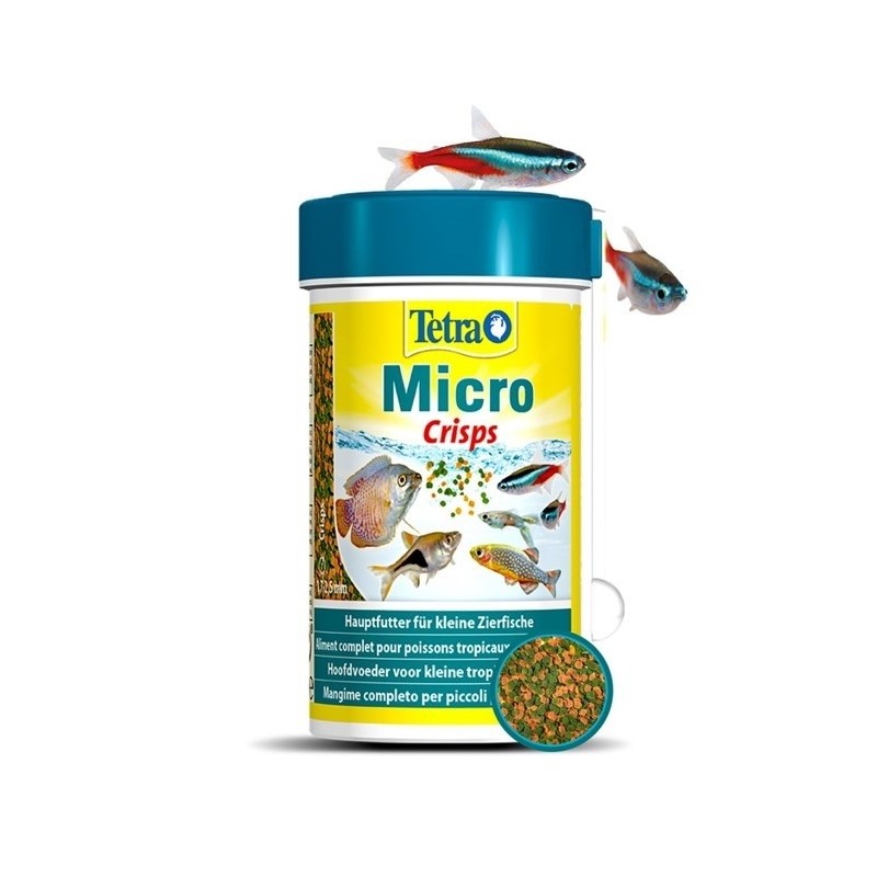 Mélanges de haute qualité spécialement développés à partir d’ingrédients pour herbivores et omnivores. Aliments adaptés aux différents besoins spécifiques des poissons d’eau douce de petite taille (>1cm). Les petites particules d'alimentation ramollissent rapidement ce qui permet aux petits poissons une consommation d'alimentation rapide et facile. Micro Crisps: Elles flottent (assez longtemps) puis coulent lentement pour répondre aux attentes des poissons de surface (Bororas brigittae, nez rouge bir-man, gourami nain, guppy endler) et de pleine eau (néons, rasbora, nez rouge, microrabora galaxie, danio rerio,tetra amapa).