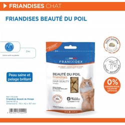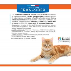Les FRIANDISES BEAUTÉ DU POIL FRANCODEX contiennent un mélange équilibré d'acides gras essentiels et de vitamines qui participent à l'amélioration des peaux sèches, irritées ou sensibles. Sans colorant ni conservateur artificiels, les friandises contiennent de la biotine et du zinc dont l'action anti-oxydante participe à la bonne santé de la peau et du pelage.