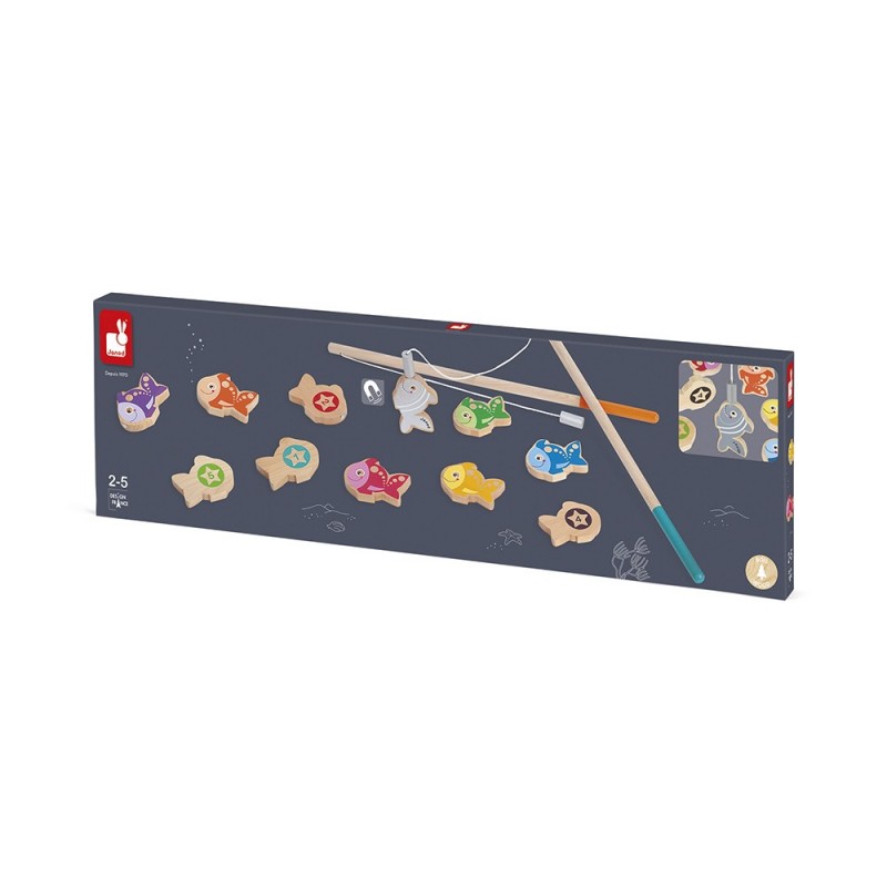 Avec ta canne à pêche, soit le premier à ramasser le plus de poissons ! Chaque poisson rapporte un certain nombre de points. Essaie d'attraper le requin en premier, il vaut déjà 10 points ! Alors que la partie de pêche commence ! Impression des poissons par sérigraphie. Bois : merisier (poissons et cannes). Boite ouverte avec fenêtre