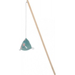 Jouet éco-conçus pour chats ETHI'CAT. Canne à pêche en bambou avec pyramide en tissu recyclé. Tissu avec motif feuille. Fabriqué à partir de 28% minimim de matières recyclées (dont polyester recyclé). Contient de l'herbe à chat pour plus d'attractivité. Jouet