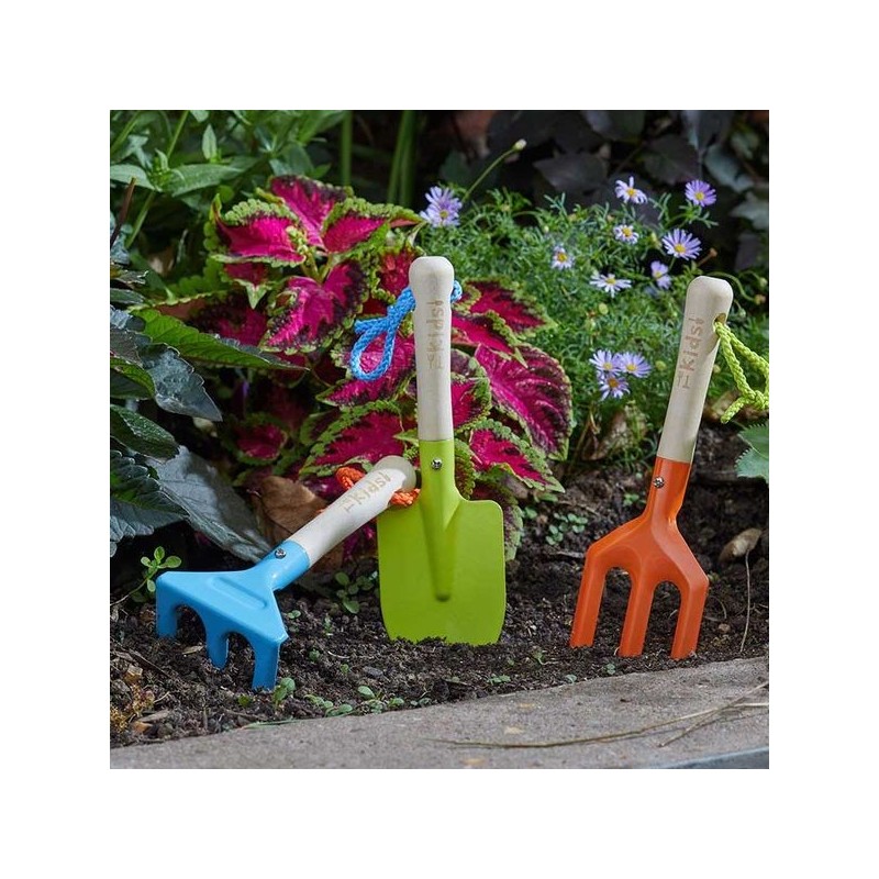 Trio d'outils de jardin pour enfant. Manche en bois certifié FSC® C126085, outil en métal - pelle: 21.5 x 6.3 x 2cm fourche: 20.5 x 7.4 x 2cm rateau : 15 x 7.5 x 3.8cm