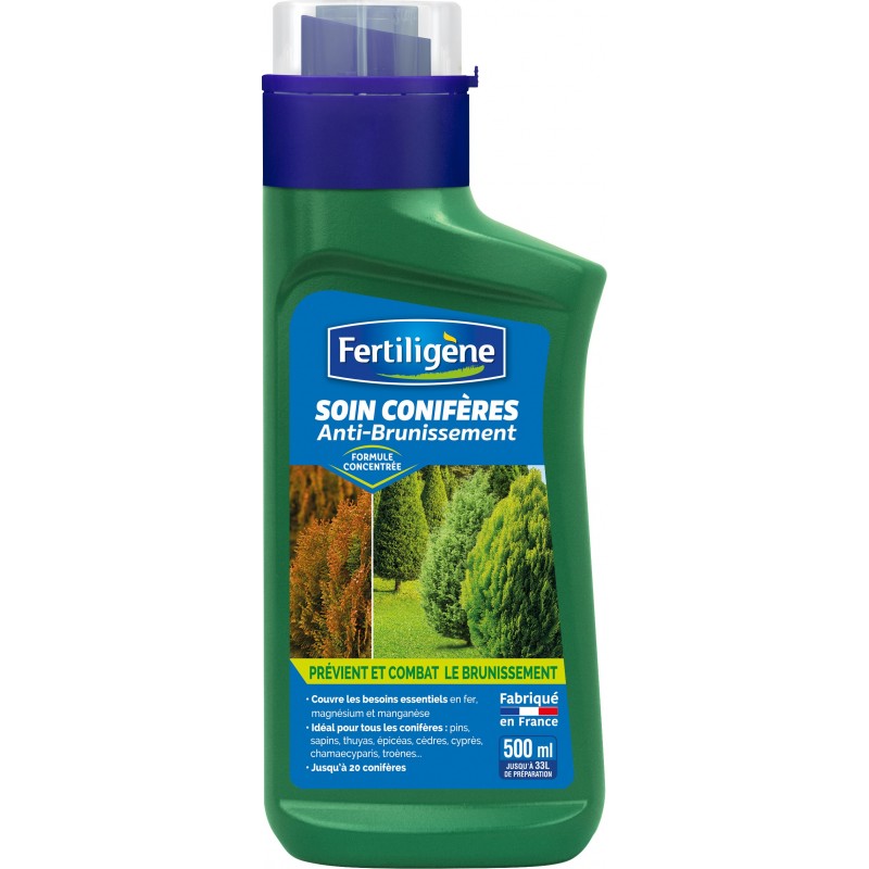 Le Soin anti-brunissement des conifères permet de lutter contre les carences responsables du brunissement des conifères. Idéal pour tous les conifères : pins, sapins, thuyas, épicéas, cèdres, cyprès, chamaecyparis, troènes... Double action : préventif et curatif. S’utilise en arrosage au pied des conifères ou en pulvérisation sur les conifères.