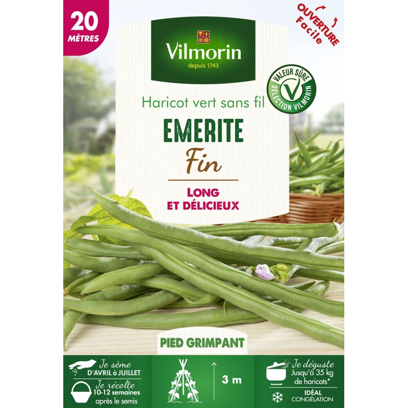 VILMORIN HARICOT Grimpant Vert Sans Fil Emerite BOÎTE Série 20M