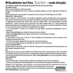 Avec Tetra Test 6in1, vérifiez en un clin d’œil si les caractéristiques de votre eau sont optimales! Les bandelettes de test permettent de contrôler 6 indicateurs de la qualité de l’eau en 60 secondes seulement. Indique le pH, la dureté carbonatée et la dureté totale (KH+GH), ainsi que la teneur en nitrites (NO2), en nitrates (NO3) et en chlore (Cl2). Le pH est un indicateur de l’équilibre acido-basique de l’eau essentiel à la santé des poissons. La valeur idéale se situe entre 6,5 et 8,5. KH – La dureté carbonatée assure la stabilité du pH. La valeur recommandée se situe généralement entre 3° et 10° dH. GH – La dureté totale a une influence directe sur la santé des poissons, des plantes et des micro-organismes. La valeur idéale se situe entre 6° et 16° dH. NO2 – Une teneur en nitrites proche de zéro est le signe que le filtre joue bien son rôle et que l'eau est sans danger pour les poissons. NO3 – La teneur en nitrates indique le degré de 'fraîcheur' de l'eau et ainsi la probabilité de voir des algues se développer. Cl2 – Indique la teneur en chlore de l’eau. Une valeur trop élevée est nocive pour les bactéries utiles et les poissons. Une bonne qualité de l’eau est absolument vitale pour les plantes et les poissons. Elle est toutefois impossible à vérifier à l’œil nu. C’est pourquoi, pour le bien-être de vos poissons, il est conseillé de la contrôler tous les 2-3 jours pour les nouveaux aquariums et toutes les semaines pour les aquariums déjà stabilisés. Passez la bandelette de test plusieurs fois dans l’eau de l’aquarium. Secouez-la pour enlever le surplus d’eau. Comparez immédiatement la section de test relative au chlore avec le nuancier de référence. Attendez 60 secondes environ puis comparez les autres sections de test du nuancier de référence.