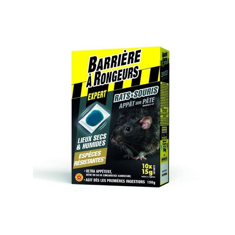 Appât prêt à l'emploi sous forme de pâte conditionné dans des sachets individuels de 15g, bien adapté à l'élimination d'espèces résistances de souris et de rats. Une formulation Expert à base de brodifacoum, matière active anticoagulante qui agit dès la 1ère ingestion et en quelques jours, celle-ci est également enrichie en céréales pour une appétence renforcée même en cas de concurrence alimentaire. Utilisable en intérieur et en extérieur, dans les lieux secs ou humides. Facile d'emploi et très efficace, déposer le sachet sans l'ouvrir dans la boîte appât.MENTIONS OBLIGATOIRES: