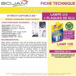 • ACTO PIÈGE À GLU - LAMPE U.V. protège votre intérieur (cuisine, salon, chambres…) des moustiques, moustiques tigres, mouches, moucherons… Attirés par la lumière ultraviolette, diffusée à 360° autour de la lampepiège, les insectes volants s’engluent sur la surface collante de la plaque de glu située à l’intérieur de la lampe-piège. Prisonniers, ils meurent rapidement. Inodore, silencieuse et sans insecticide, la lampe-piège simplifie au quotidien la lutte contre les insectes volants indésirables dans les habitations. La plaque de glu est efficace jusqu’à 2 mois, en fonction de la poussière, et est à jeter dès qu’elle est pleine.