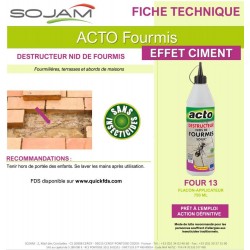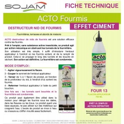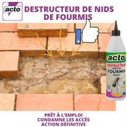 • ACTO destructeur de nids de fourmis est une solution efficace contre les fourmis. Prêt à l’emploi, sans substance active insecticide, ce produit agit par action mécanique en obstruant les tunnels de la fourmilière. Son utilisation est très simple, il suffit d’introduire l’embout applicateur à l’endroit où les fourmis sortent, et de le remplir de produit. Celui-ci se propage le long des tunnels et les bouche en séchant. Son action est définitive. La fourmilière est condamnée.