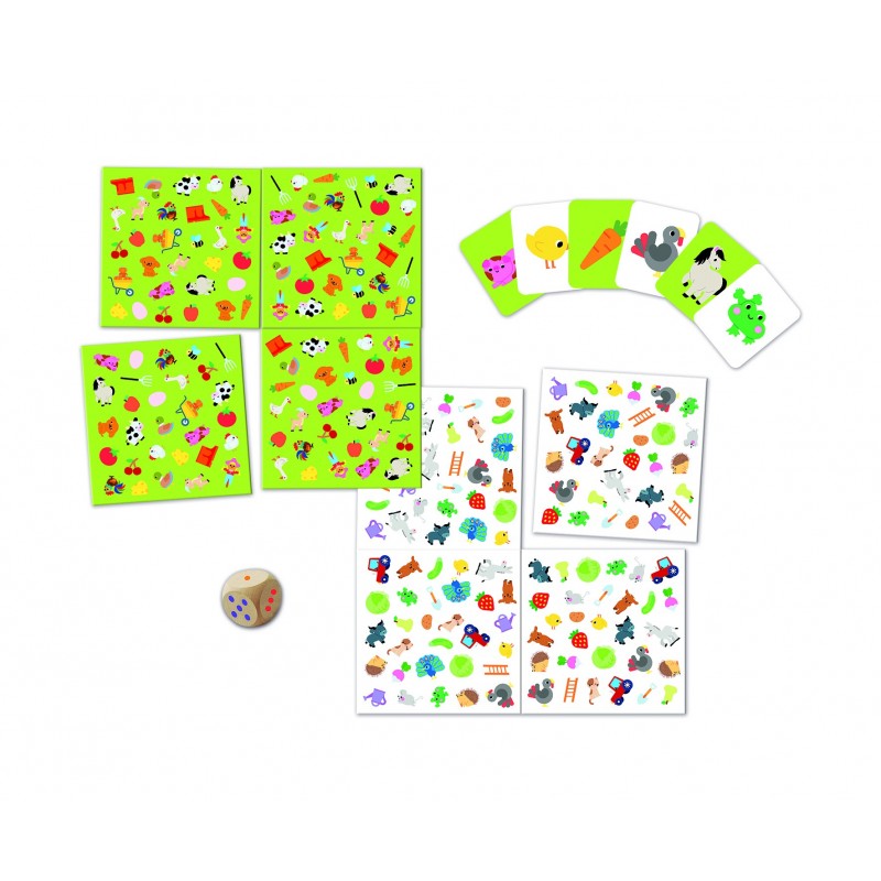 Immersion imminente à la ferme ! Le but du jeu est de trouver tous ensemble des éléments sur les plateaux pour gagner 10 cartes. On choisit le côté blanc ou vert du plateau et on joue avec le côté des cartes de la même couleur. Le plus jeune joueur lance le dé puis il pioche une carte et la montre aux autres joueurs. C'est l'élément qu'ils doivent retrouver sur le plataeau, autant de fois que le chiffre indiqué par le dé. La carte est gagnée si le nombre d'élément à trouver est atteint. Sinon, la carte est perdue. Une variante rapido est possible: il faut gagner le maximum de cartes sur une durée de 5 minutes. Il est aussi possible de jouer en solo ! La boîte contient 1 plateau de jeu recto-verso en quatre parties, 20 cartes recto-verso, 1 dé en bois et les règles du jeu en 7 langues. Une partie "classique" dure environ 15 minutes. De 1 à 4 joueurs. Dès 3 ans.