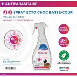 Sans rinçage, le spray ECTO CHOC PARASITES DUO FRANCODEX déjoue rapidement une infestation par des parasites externes. Il entoure le parasite d'un film liquide qui le bloque et le rend inactif. Son action purement mécanique et ses ingrédients d'origine végétale* permettent une utilisation précoce, sur l'animal et dans son environnement, en laissant un parfum rais après utilisation.