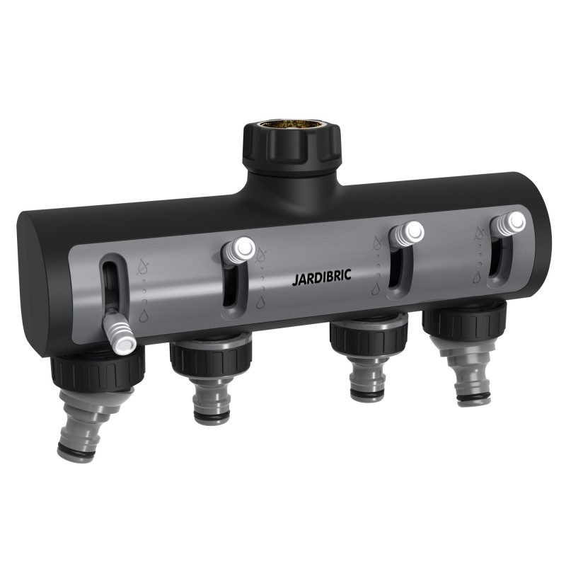Selecteur 4 sorties filetees avec nez de robinet. entree femelle 20x27. 4 sorties male 20x27 equipes de 2 nez de robinet + 2 nez de robinet orientables, entree en metal gaine