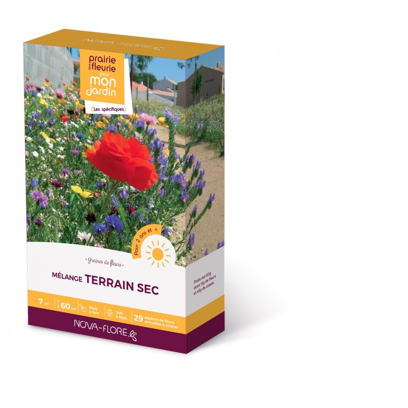 Adapté aux terrains séchants et à tout type de structure de sol, le mélange spécial Terrain Sec offre une très belle floraison dès la première année.