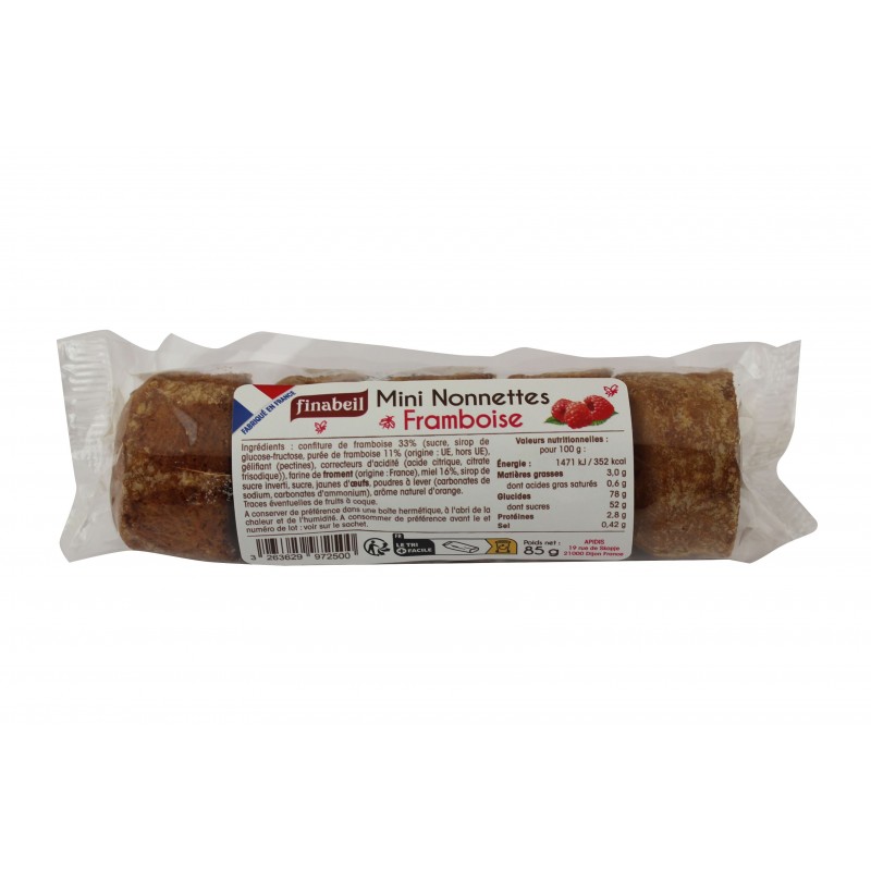 MENTIONS OBLIGATOIRES : Ingrédients : Confiture de framboise 33% (sucre, sirop de glucose-fructose, purée de framboise 11%, gélifiant (pectines), correcteurs d'acidité (acide citrique, citrate trisodique)), farine de froment (origine : France), miel 16%, sirop de sucre inverti, sucre, jaunes d'oeufs, poudres à lever (carbonates de sodium, carbonates d'ammonium), arôme naturel d'orange.