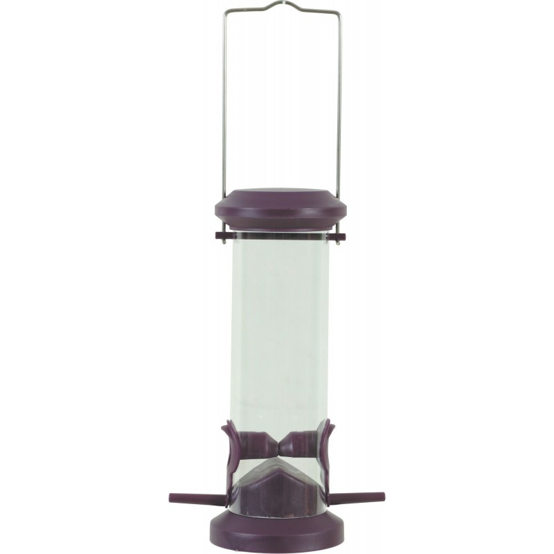 Mangeoire silo en plastique avec 2 perchoirs et un poignée en métal rétractable permettant de la suspendre. Les perchoirs sont vissés pour plus de résistance. La mangeoire silo vous permets de mettre à diposition environ 350g de graines pour les oiseaux du jardin (cette contenance peut varier en fonction du calibre des graines utilisées).