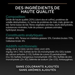 Contient de la Dinde de haute qualité en 1er ingrédient. Sans colorants ajoutés. Sans arômes ajoutés. Contient OPTIRenal®, une formulation unique pour maintenir des reins en bonne santé.