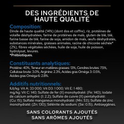 Contient de la Dinde de haute qualité en 1er ingrédient. Sans colorants ajoutés. Sans arômes ajoutés. Contient LONGEVIS®, une formule brevetée, prouvée pour allonger la durée de vie en bonne santé et améliorer la qualité de vie*