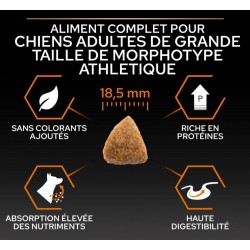 PURINA PRO PLAN Large Athletic Adult avec OPTIBALANCE est une alimentation complète pour chiens de grande taille de morphotype athlétique, formulée pour satisfaire leurs besoins nutritionnels. OPTIBALANCE est une combinaison de nutriments spécifiques avec des teneurs adaptées à l'âge de votre chien et à sa taille, favorisant son bien-être et le maintien de sa bonne santé.